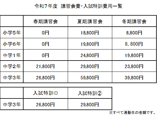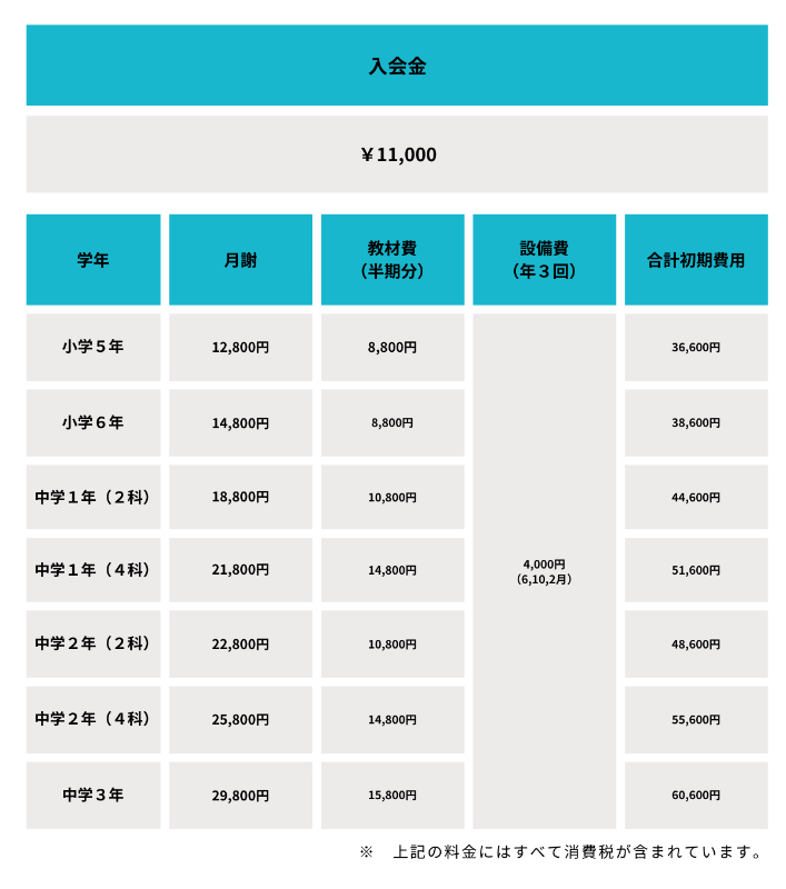 全学年11,000円です。入塾時にご納入いただきます。