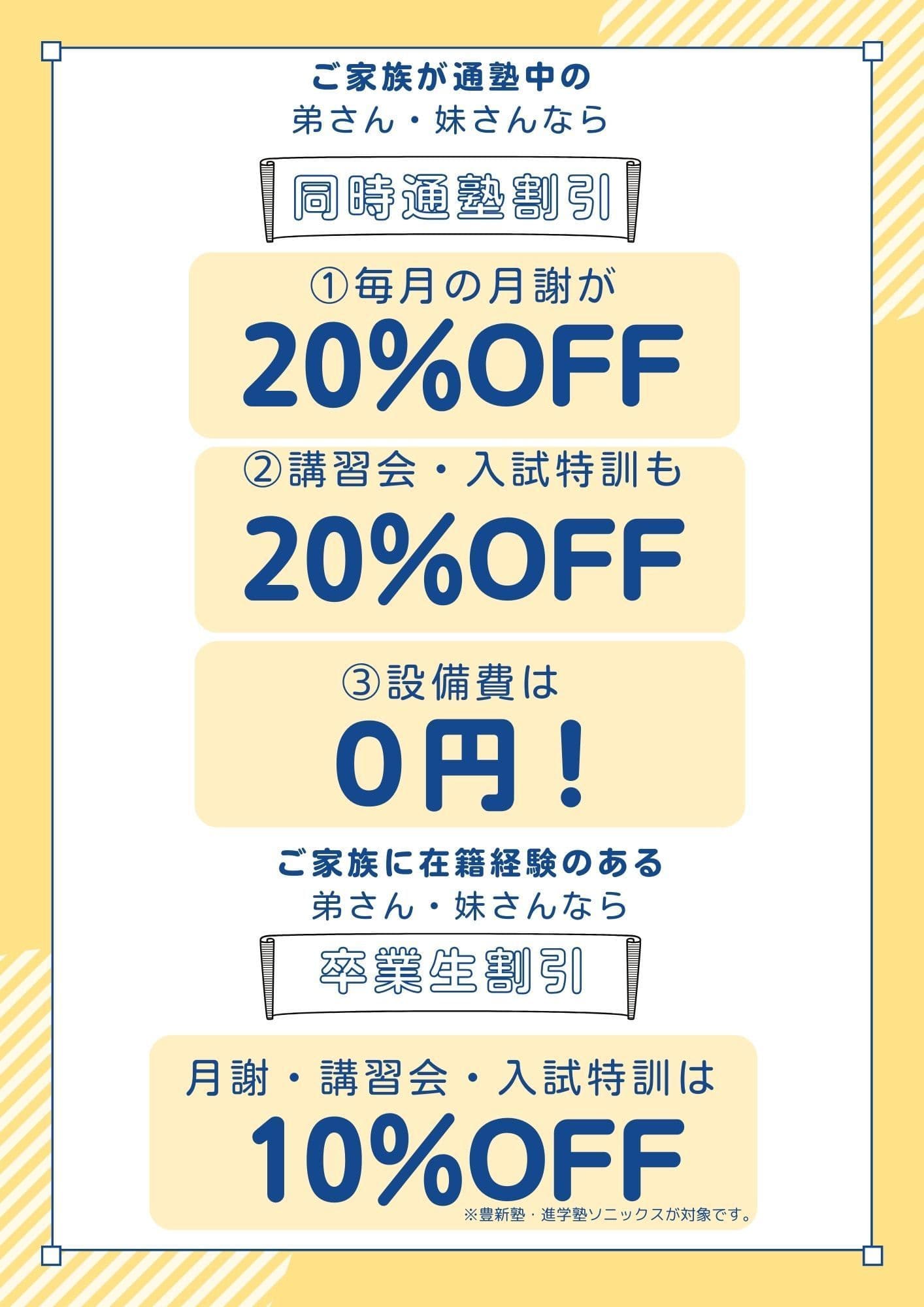 | 兄姉に進学塾ソニックス・豊新塾の在籍経験がある場合 | 入塾金 →免除 月謝・講習会費・入試特訓費が →10%割引 |